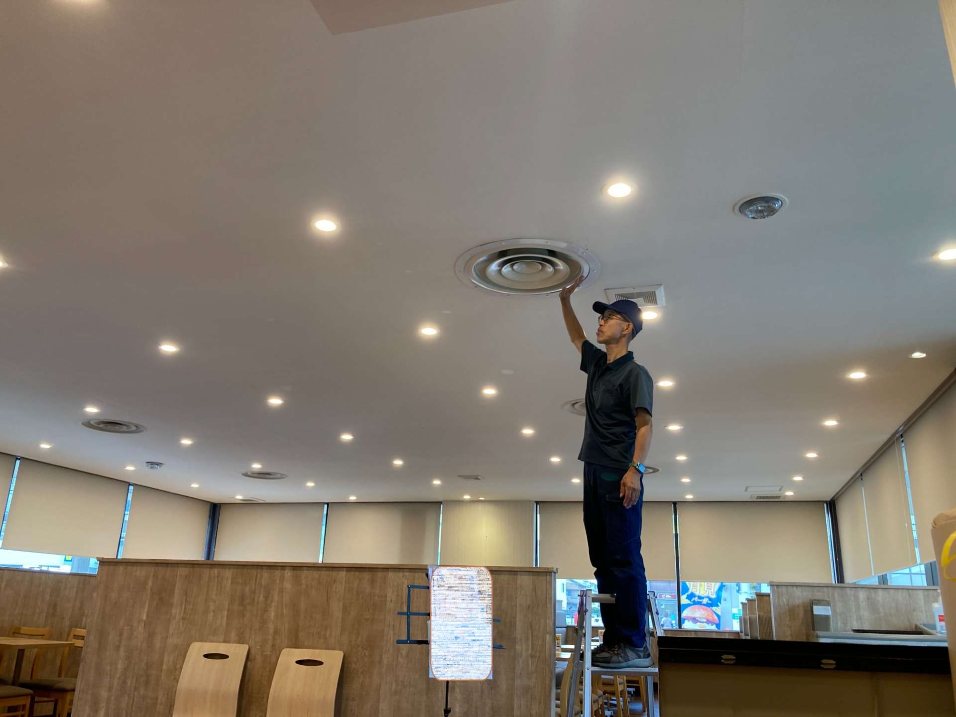 ファーストフード店の客席全体の空調を1台のエアコンでまかなっていましたが、その1台が故障してしまいました。