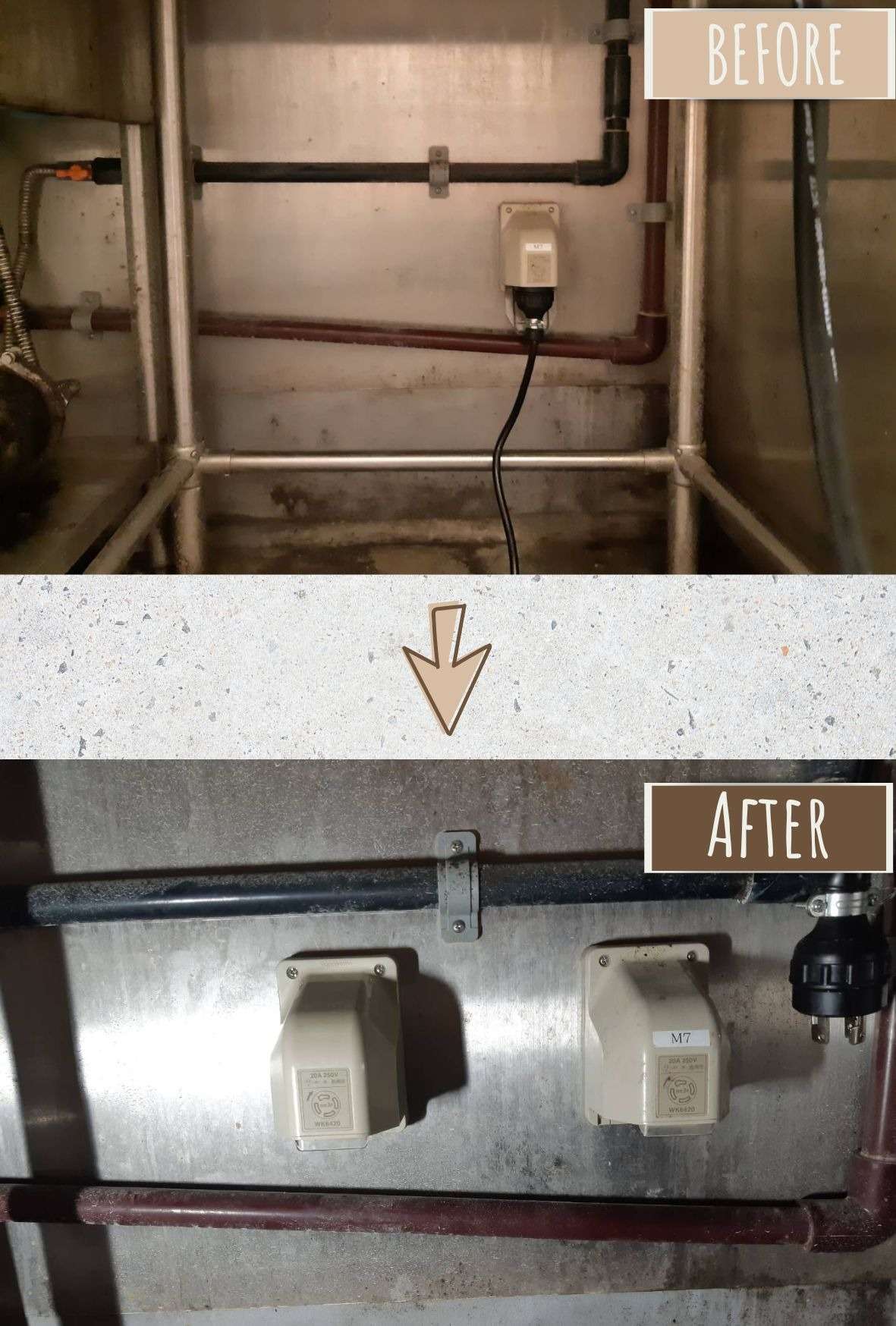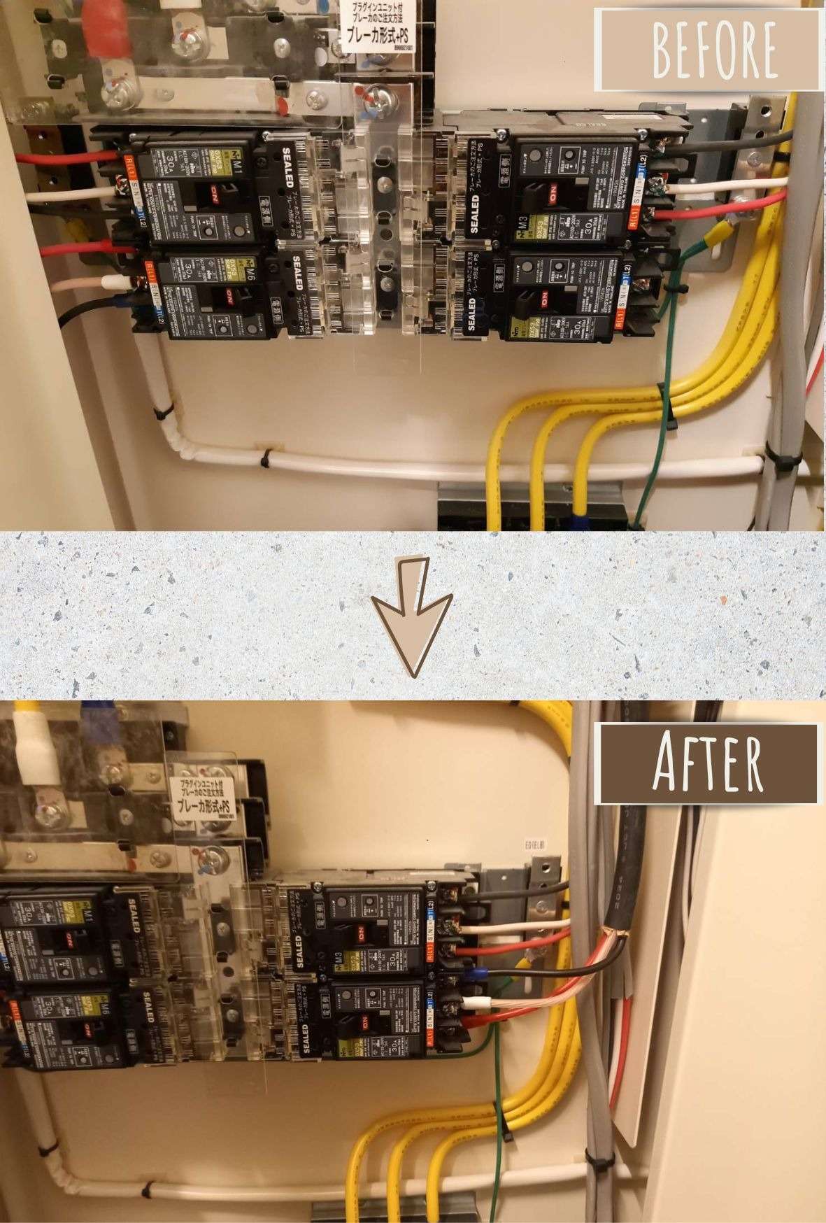 分電盤内にブレーカーの空きがあったため、分電盤内から天井裏に配線を通し、蒸し器が設置してある台の裏の壁まで引き下ろして、蒸し器専用のコンセントを新設いたしました。